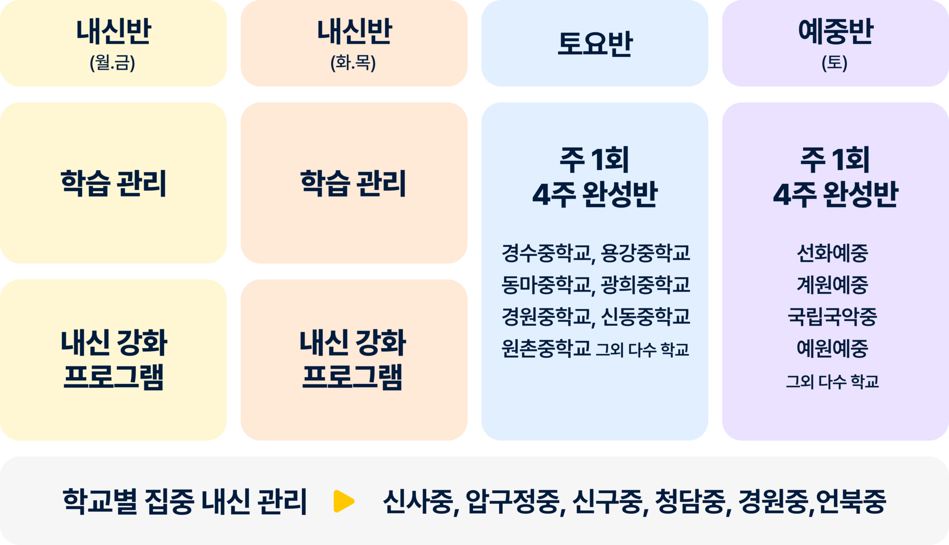 학교 내신 시험 전에 한 달 동안 내신 관리 수업을 합니다.-> 이후 정규반 수업을 진행하며, 내신반만 등록 가능합니다.