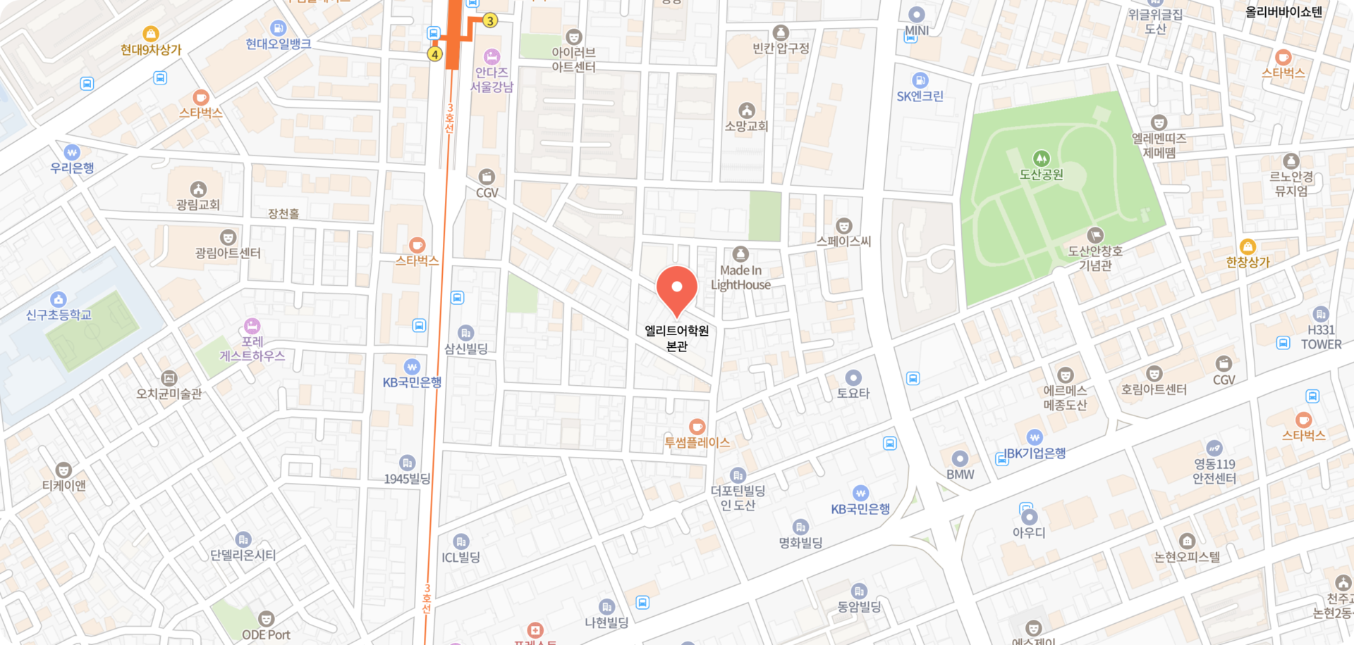 엘리트어학원 압구정 본관 주소 : 서울 강남구 논현로168길 36, 안국빌딩 5층지하철 : 3호선 압구정역 3번 출구 → 도보 약 6분버스 : 141번(파랑), 3011번(녹색) → 신구중학교 정류장 하차